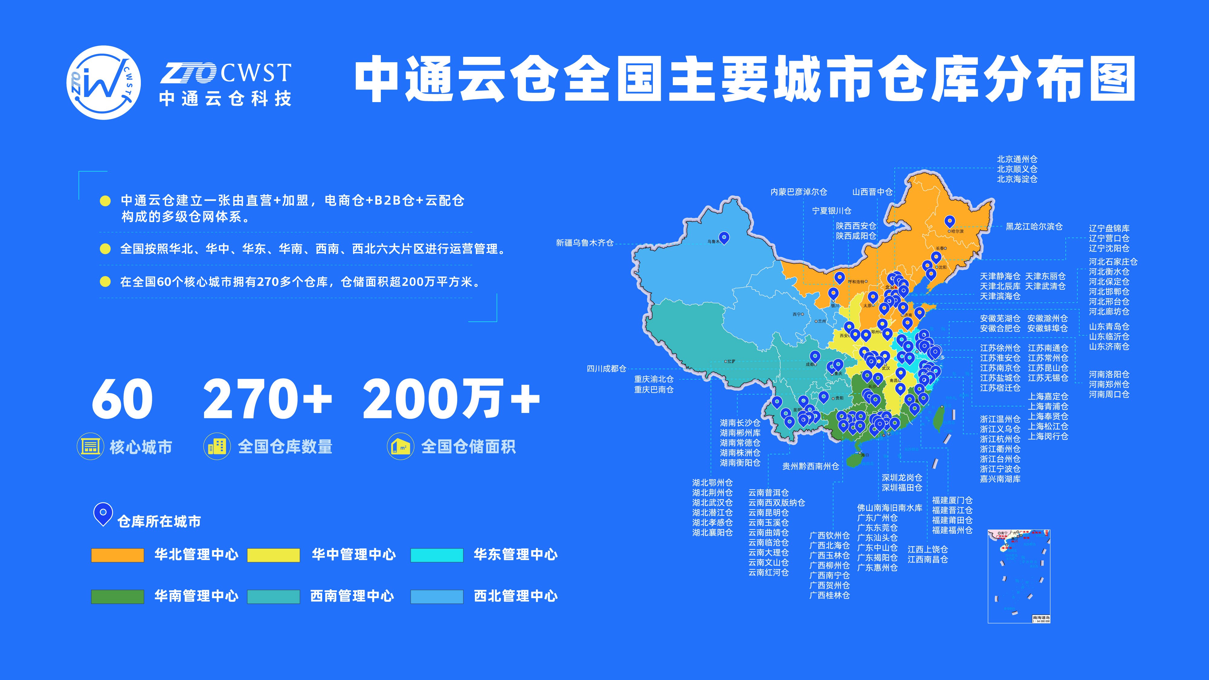 中通云倉科技建立了一張由直營+加盟,電商倉+B2B倉+云配倉構成的多級倉網體系。全國按照華北、華東、華南、華中、西南、西北六大管理中心進行運營管理。在全國60個核心城市擁有270多個倉庫,倉儲面積超200萬平方米。了解更多